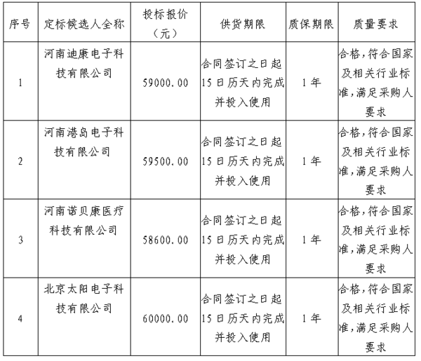 ******醫(yī)院數(shù)字化腦電監(jiān)護(hù)分析儀項(xiàng)目進(jìn)行公開(kāi)招標(biāo),于******委員會(huì)按照招標(biāo)文件規(guī)定進(jìn)行了評(píng)審,經(jīng)招標(biāo)人確認(rèn),現(xiàn)將本次評(píng)標(biāo)結(jié)果公示如下: