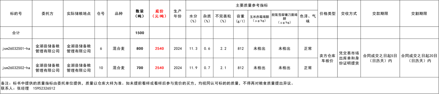 質(zhì)量:公告中提供的質(zhì)量指標由委托單位提供,僅供參考。競購方須到庫點看樣(看樣時間需提前預約,聯(lián)系人:張經(jīng)理?******),以確保對質(zhì)量及保管狀況有充分了解。如競購方未進行看樣,則在成交后應自覺履行各項義務,且不得以質(zhì)量問題為由提出異議或申請商務處理。