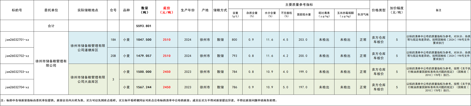 數(shù)量:總計(jì)5593.801噸,其中2023年產(chǎn)小麥3067.244噸,2024年產(chǎn)小麥2526.557噸,共4個(gè)標(biāo)段(詳見交易清單)。