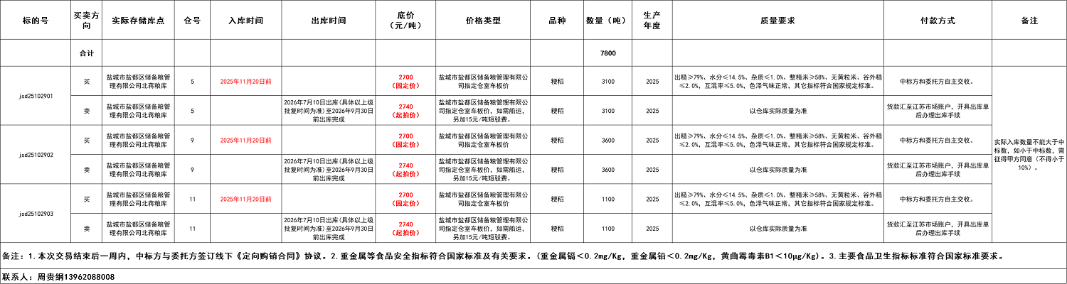 2025年產(chǎn)新粳稻7800噸,分3個(gè)標段。(詳見(jiàn)交易清單)